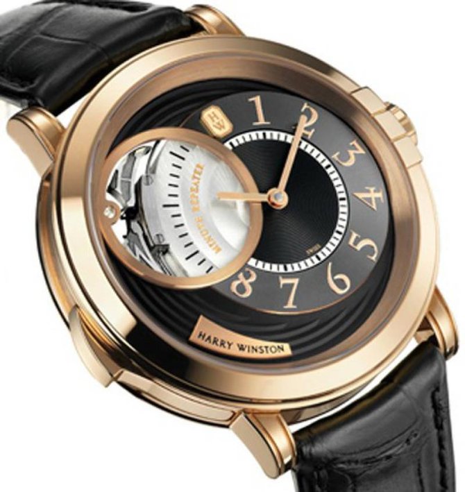 Известная на весь мир американская компания Harry Winston, которая специализируется на изготовлении великолепных часов, а также ювелирных изделий, и берет свое начало в далеком 1932 году, представляет Вашему вниманию очередную модель мужских наручных часов Midnight Minute Repeater MIDMMR42RR002 из коллекции Midnight. Данная модель будет интересна любителям необычных классических дизайнов, подчеркивающие оригинальный стиль, а также функциональных устройств. Корпус круглой формы отполирован до блеска, выполнен из розового золота в восемнадцать карат, его размер составляет 42мм в диаметре. Основные функции часов это часы, минуты, и главное достоинство модели - репетир. Механизм часов с автоматический, имеет запас хода на 70 часов. Циферблат часов черно-золотистого цвета, гильошированный, что подчеркивает элегантность изделия. Браслет часов черный, выполнен из кожи аллигатора, оснащен откидной золотой застежкой. Стрелки которые находятся на циферблате, отлиты вручную из вороненной стали. Прочное сапфировое стекло закрывает корпус, а задняя крышка находится под давлением. Водонепроницаемость модели составляет 30 метров. Заводной ключ находится на позиции трех часов. Серия данной модели ограничена в 40 экземпляров.