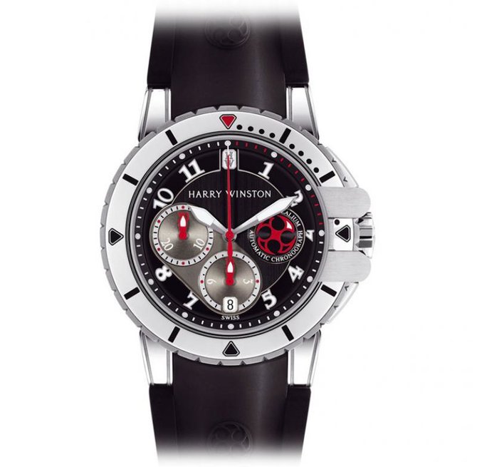 Известная на весь мир американская компания Harry Winston, которая специализируется на изготовлении великолепных часов, а также ювелирных изделий, и берет свое начало в далеком 1932 году, представляет Вашему вниманию очередную модель мужских наручных часов Ocean Diver 410/MCA44WZC.K из коллекции Ocean. Данная модель будет интересна любителям строгих модернистических дизайнов, подчеркивающие оригинальный стиль, а также функциональных высококачественных устройств. Корпус круглой формы отполирован до блеска, выполнен из белого золота в восемнадцать карат а также залиума, его размер составляет 44 мм в диаметре. Основные функции часов это часы, минуты, секунды, дата, звездочка-сюрикен - индикатор нормального функционирования механизма. Механизм часов автоматический, имеет запас хода на 42 часа, оснащен калибром GP 31C6S/R. Циферблат часов черно-серого цвета. Ремешок часов выполнен из каучука, оснащен откидной золотой застежкой. Стрелки которые находятся на циферблате, отлиты вручную из вороненной стали. Прочное сапфировое стекло закрывает корпус, а задняя крышка находится под давлением. Водонепроницаемость модели составляет 200 метров. Индикатор даты находится на позиции шести часов. Одна из главных особенностей часов, это вращающийся безель.