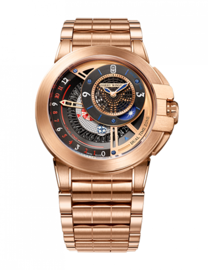 Популярный американский бренд Harry Winston, известный своими часовыми и ювелирными изобретениями, представляет модель наручных часов на механическом механизме, калибр HW33502, с функцией автоматического подзавода, обеспечивающем индикацию часов, минут и секунд на циферблате, защищенном сапфировым стеклом, которое по своей прочности, как известно, уступает только лишь алмазу. Также модель оснащена индикаторами даты, "день/ночь" и второго времени (GMT). Золотой корпус, благодаря своей герметичности, способен выдержать давление воды до уровня 100 метров глубины. Диаметр корпуса представленных мужских часов составляет 44 миллиметра. Запас хода механизма - 72 часа. Циферблат скелетонизирован. Модель выпущена в 2015 году.