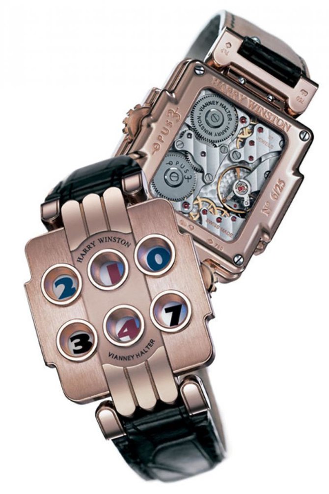 В 2003 году появилась футуристичная модель, перевернувшая вверх дном представление о высоком часовом искусстве. Часы Opus 3, созданные часовщиком Винни Халтером, были удостоены премии Grand Prix d’Horlogerie de Geneve за техническую инновацию и сложность. В их прямоугольном корпусе, который его создатели прозвали "контейнером", имеются шесть отверстий-иллюминаторов, в которых отображаются "прыгающие" часы, минуты и дата, без помощи стрелок. Синим цветом обозначены цифры, отвечающие за индикацию часов, черным - за индикацию минут, и, наконец, красные цифры, которые следует читать по вертикали, обозначают дату. Кроме того, перед сменой очередного часа или минуты в верхнем окне производится обратный отсчёт последних четырёх секунд каждой минуты. Вместо традиционной вертикальной (по отношению к часовому механизму) заводной головки, в часах Opus 3 применена горизонтальная коронка. Для использования ее надо смещать вверх или вниз по четырем уровням: на первом происходит завод механизма, а на остальных - установка часов, минут, даты. Механизм с ручным заводом, выполненный из немецкого серебра (28,8 х 29,6 мм, толщина 7,50 мм), оснащен двумя барабанами и двумя блоками зубчатых колес, состоит из 250 деталей и бьется с частотой 21 600 полуколебаний в час. Необычная индикация времени осуществляется за счет десяти дисков, которые содержат в общей сложности 47 арабских цифр – от трех до шести цифр на каждом диске – и обращаются вокруг своей оси на различной скорости, чтобы отображать часы, минуты и дату. Данная версия выпущена в корпусе из розового золота в количестве 25-ти экземпляров.