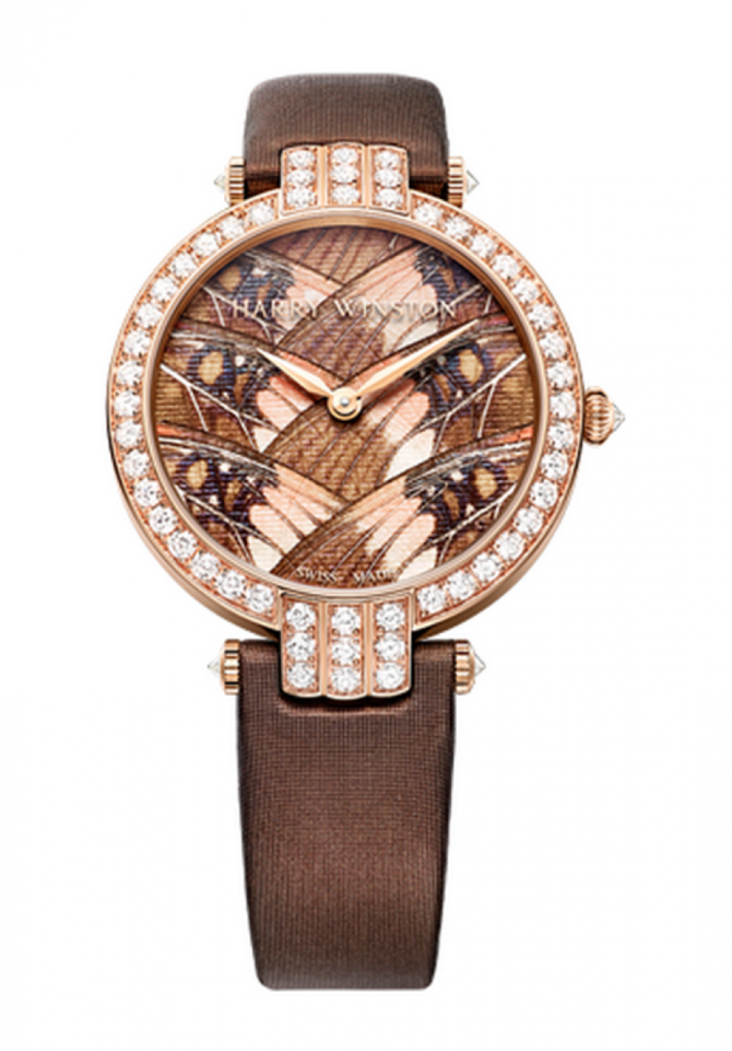 The Premier Collection - это первая коллекция часов, созданная американской часовой компанией Harry Winston еще в 1989 году, а в настоящее время являющаяся визитной карточкой бренда. Три арки, фиксирующие браслет часов коллекции, выполнены в стиле фасада Harry Winston в салоне на Пятой авеню. Эта коллекция отражает смелый новаторский дух Harry Winston, демонстрирующий совершенство и творческий потенциал компании в часовом деле. Данная модель женских наручных часов выполняет функцию индикации текущего времени на художественном циферблате часов с помощью автоматического механизма, калибр HW2008. Корпус, украшенный 74 белыми бриллиантами, весом в 2.47 carats, изготовлен из розового золота. На циферблате изображен образ бабочки. Ремешок, которым укомплектована данная модель, сатиновый. Он наделен классической пряжкой из розового золота, инкрустированной 17 бриллиантами, весом в 0.15 carat. Водостойкость корпуса равна 30 метрам глубины.