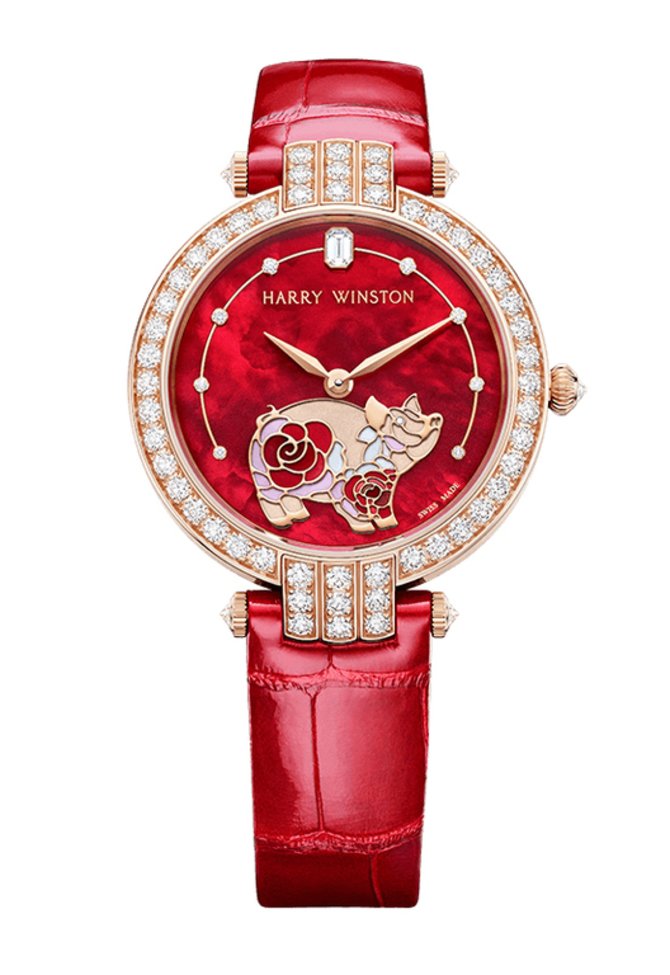 Шикарные ювелирные швейцарские часы для женщин HARRY WINSTON Premier Chinese New Year Automatic 36 mm (Ref. PRNAHM36RR024) представлены в 2019 году в круглом корпусе, выполненном из розового золота с инкрустацией натуральными белыми бриллиантами классической огранки. На перламутровом циферблате находится ювелирный образ свиньи, бриллианты в виде часовых меток, а также стрелки из розового золота для индикации данных текущего времени. Накрыт циферблат стеклом из сапфирового кристалла с противобликовым эффектом. На запястье руки часы фиксируются ремешком из натуральной кожи аллигатора красного цвета и застежкой из золота. Установленный механизм HW2008 обладает запасом хода на 72 часа.