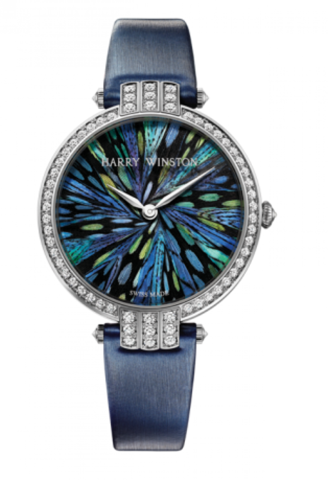 Американский часовой и ювелирный бренд Harry Winston выпустил в мир новую серию ювелирных женских наручных часов Feathers, которые пополнили широкий ряд коллекции Premier. Работа над этими часами объединила два древних ремесла - производство плюмажей и часовое искусство. Именно по просьбе Гарри Уинстона Нелли Сонье, одна из последних представительниц данного ремесла, наделила часовые циферблаты перьями фазанов - обыкновенного, алмазного и серебристого, а также павлина. Изготовление одного циферблата отнимало у мастера около семи часов. Работа выполнялась исключительно вручную, а результат доказывает, что она просто не могла выполняться в спешке. Часы работают на мануфактурном кварцевом механизме, калибр HW1042, гарантирующем индикацию часов и минут. Корпус часов выполнялся из качественного 18-каратного золота и декорировался белыми классическими бриллиантами. Герметичность корпуса часов равна 30 метрам глубины. Ремешок, идущий в комплекте, сатиновый, с классической золотой застежкой, также инкрустированной бриллиантами.