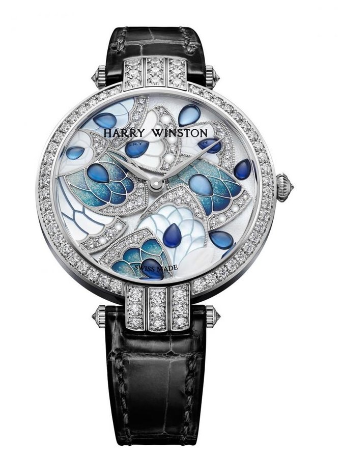 Богатство драгоценных камней и разносторонность матушки природы подтолкнуло часовщиков американского бренда Harry Winston на выпуск часов Precious Marquetery, которые вошли в элегантную ювелирную коллекцию компании Premier. В представляемых ювелирных часах можно рассмотреть образ бабочки, птицы или же лепестки какого-нибудь экзотического цветка, стоит только включить воображение. Произведение этих наручных часов, а точнее создание изумительного дизайна для них, отобрало у мастеров бренда более ста часов работы. Золотой часовой циферблат декорирован сапфирами, бриллиантами, натуральным перламутром и эмалью. Корпус модели Premier Precious Marquetery инкрустирован 63 бриллиантами классической огранки. Внутри корпуса расположен кварцевый механизм, калибр HW1042, обеспечивающий индикацию самой главной функции наручных часов - текущего времени.