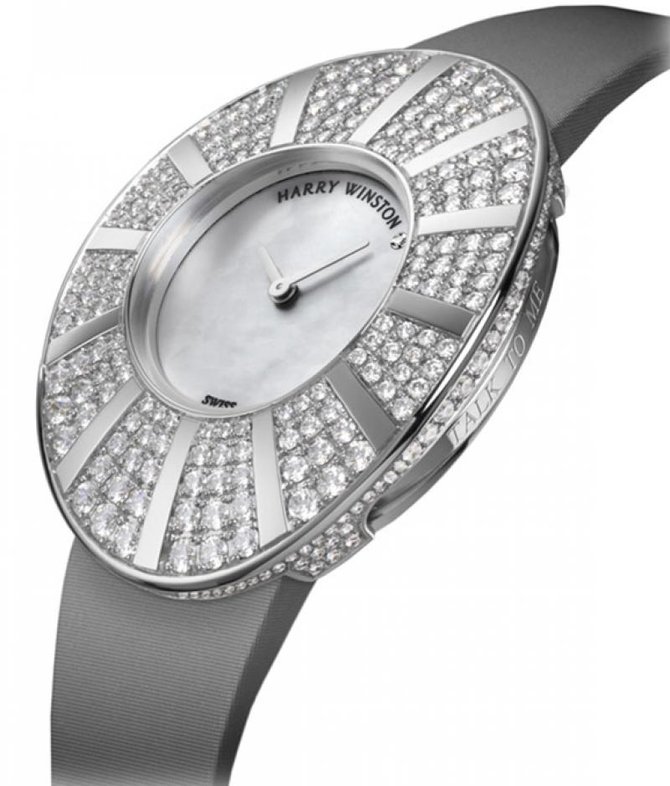 Не один десяток лет фирма Harry Winston неразрывно связана с изысканными украшениями и драгоценными камнями высокого качества. Облик часовых творений Harry Winston это не просто предмет обихода. Изысканность дизайна и необходимое для их создания выдающееся мастерство пробуждают в душе особые чувства. Если механизм можно назвать сердцем часов, то циферблат несомненно является их душой, которая по определению наполнена жизнью. Новая модель коллекции Talk To Me представлена в овальном корпусе из белого золота, размером 40 х 33 мм, украшен множеством прекрасных мелких бриллиантов, оснащена кварцевым механизмом и поставляется на нежном кожаном ремешке.