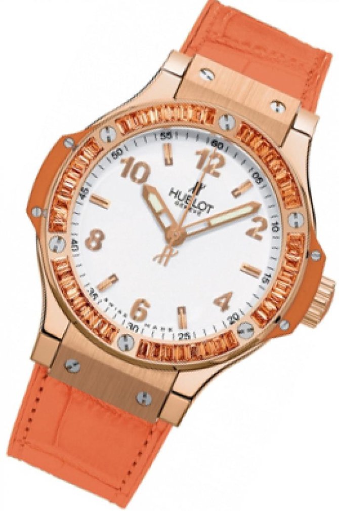 Производитель Hublot, известный во всем мире своими великолепными часовыми шедеврами представляет очередную модель женских наручных часов из серии Big Bang 38mm Tutti Frutti Big Bang Gold (361.PO.2010.LR.1906). Данная модель несомненно обрадует женщин своим привлекательным внешним видом и функциональностью. Одна из главных особенностей Tutti Frutti Big Bang Gold это повышенная водостойкость. Корпус имеет круглую форму, выполнен из 18-каратного розового золота. Диаметр корпуса - 38 мм. Циферблат часов белый. Стрелки золотистые, отлиты вручную часовыми мастерами. Ультратонкий автоматический механизм оснащен калибром HUB 2900. Стекло сделанное из сапфира закрывает циферблат данной модели. Запас хода в данной модели 42 часа. Ремешок оранжевого цвета сделан из кожи аллигатора. На ремешке присутствует золотая 18-каратная вставка и откидная застежка. Водонепроницаемость модели составляет 100 метров. Безель украшен из 48-и оранжевых багетных цаворитов.