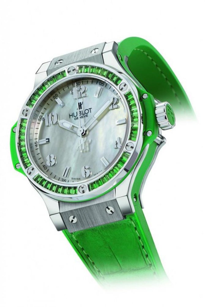 Производитель Hublot, известный во всем мире своими великолепными часовыми шедеврами представляет очередную модель женских наручных часов из серии Big Bang 38mm Tutti Frutti Big Bang Steel (361.SG.6010.LR.1922). Данная модель несомненно обрадует женщин своим привлекательным внешним видом и функциональностью. Одна из главных особенностей Tutti Frutti Big Bang Steel это повышенная водостойкость. Корпус имеет круглую форму, комбинированный, выполнен из нержавеющей стали и каучука. Диаметр корпуса - 38 мм. Циферблат часов белый. Стрелки стальные, отлиты вручную часовыми мастерами. Ультратонкий автоматический механизм оснащен калибром HUB 2900. Стекло сделанное из сапфира закрывает циферблат данной модели. Запас хода в данной модели 42 часа. Ремешок зеленого цвета сделан из кожи аллигатора и каучука. На ремешке присутствует вставка из нержавеющей стали и откидная застежка. Водонепроницаемость модели составляет 100 метров. Безель украшен из 48-и зеленых багетных цаворитов.