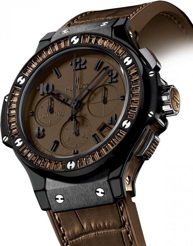 Великолепная модель женских наручных часов из серии Big Bang 41mm Ladies Tutti Frutti Big Bang Black 341.CC.5490.LR.1916 от профессионалов своего дела, производителя Hublot, привлекает к себе внимание, и не оставит ни одну женщину равнодушной благодаря необычному дизайну и широкому функционалу модели. Наличие хронографа - подчеркивает функциональность Tutti Frutti Big Bang Black 341.CC.5490.LR.1916. Круглый комбинированный корпус сделан из 18-каратного белого золота, каучука, керамики и покрытия PVD имеет такие параметры: 41мм в диаметре. Автоматический механизм данной модели оснащен калибром HUB4300, и имеет запас хода на 42 часа. Прочные сапфировые стекла, устойчивые к царапинам и другим повреждениям закрывают корпус с обеих сторон. На коричневом циферблате, великолепно смотрятся отлитые вручную стальные стрелки. Апертура с датой находится на позиции между 4 и 5 часами. Ремешок выполнен из кожи аллигатора, оснащен вставкой из нержавеющей стали. Водонепроницаемость данной модели составляет 100 метров. Любители драгоценностей не пройдут мимо, потому как безель сделан из белого золота с черным PVD-покрытием, инкрустированный 48-ю дымчатыми багетными кварцами.
