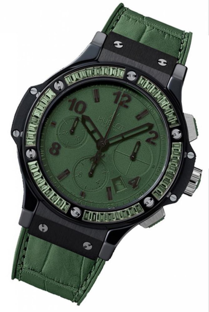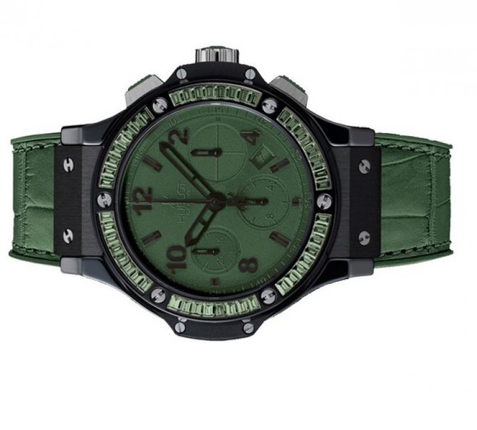 Великолепная модель женских наручных часов из серии Big Bang 41mm Ladies Tutti Frutti Big Bang Black 341.CV.5290.LR.1917 от профессионалов своего дела, производителя Hublot, привлекает к себе внимание, и не оставит ни одну женщину равнодушной благодаря необычному дизайну и широкому функционалу модели. Наличие хронографа - подчеркивает функциональность Tutti Frutti Big Bang Black 341.CV.5290.LR.1917. Круглый комбинированный корпус сделан из 18-каратного белого золота, керамики, каучука, и имеет такие параметры: 41мм в диаметре. Автоматический механизм данной модели оснащен калибром HUB4300, и имеет запас хода на 42 часа. Прочные сапфировые стекла, устойчивые к царапинам и другим повреждениям закрывают корпус с обеих сторон. На черном циферблате, великолепно смотрятся отлитые вручную стальные стрелки. Апертура с датой находится на позиции между 4 и 5 часами. Ремешок выполнен из кожи аллигатора, оснащен вставкой из нержавеющей стали. Водонепроницаемость данной модели составляет 100 метров. Любители драгоценностей не пройдут мимо, потому как безель выполнен из белого золота с черным PVD-покрытием, инкрустированный 48-ю зелеными багетными сапфирами.