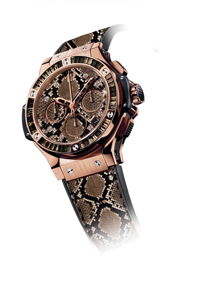Великолепная модель женских наручных часов из серии Big Bang 41mm Ladies Boa Bang 341.PX.7918.NR.1979 от профессионалов своего дела, производителя Hublot, привлекает к себе внимание, и не оставит ни одну женщину равнодушной благодаря необычному дизайну и широкому функционалу модели. Повышенная водостойкость модели и хронограф - подчеркивают функциональность Boa Bang 341.PX.7918.NR.1979. Круглый корпус выполнен из 18-каратного розового золота, имеет такие параметры: 41мм в диаметре. Автоматический механизм данной модели оснащен калибром HUB4300, и имеет запас хода на 42 часа. Прочные сапфировые стекла, устойчивые к царапинам и другим повреждениям закрывают корпус с обеих сторон. На коричнево-золотистом циферблате, великолепно смотрятся отлитые вручную стальные стрелки. Апертура с датой находится на позиции между 4 и 5 часами. Ремешок выполнен из каучука и кожи боа, оснащен вставкой из 18-каратного розового золота. Водонепроницаемость данной модели составляет 100 метров. Еще одна особенность: безель украшен из 48 багетных андилузитов и кварца.