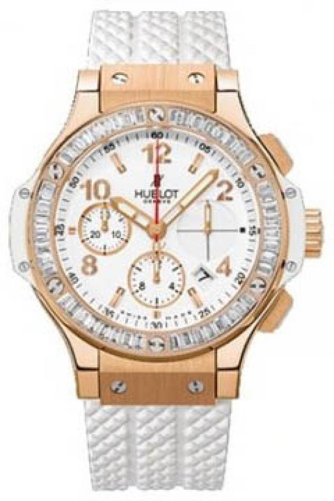 Очередная интересная модель мужских наручных часов Red Gold White Big Bang 41mm Collection 341.PE.230.RW.194 от производителя Hublot привлекает к себе великолепным дизайном и другими достоинствами. Одна из главных особенностей данной модели это хронограф. Круглый полированный корпус выполнен из розового 18-каратного золота, а диаметр корпуса равен 41 мм. На белом циферблате красиво смотрятся позолоченные отлитые вручную стрелки. Окошко с датой находится в положении между 4 и 5 часами. Стекла которые закрывают корпус выполнены из сапфира, который устойчив к царапинам и другим повреждениям. Благодаря задней прозрачной крышке сделанной из сапфира, можно наблюдать за работой механизма. Ультратонкий механизм оснащен автоматическим калибром HUB 41 и имеет запас хода на 42 часа. Водонепроницаемость составляет 100 футов, что равняется 30 метрам.Белый каучуковый ремешок оснащен золотой 18-каратной раскладывающейся застежкой. Безель украшен 48-ю белыми багетными бриллиантами 2.23 ct.