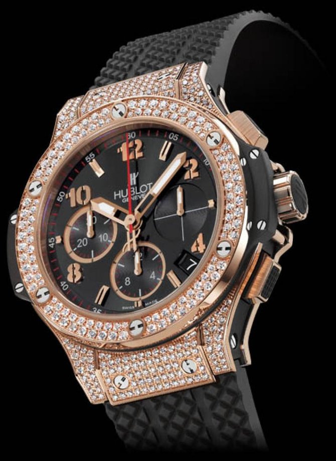 Непревзойденная модель мужских наручных часов Red Gold Diamonds Big Bang 41mm Collection 341.PX.130.RX.174 от производителя Hublot привлекает к себе великолепным дизайном и другими достоинствами. Одна из главных особенностей данной модели это хронограф. Круглый полированный корпус выполнен из розового 18-каратного золота, а диаметр корпуса равен 41 мм. На черном циферблате красиво смотрятся позолоченные отлитые вручную стрелки. Окошко с датой находится в положении между 4 и 5 часами. Стекла которые закрывают корпус выполнены из сапфира, который устойчив к царапинам и другим повреждениям. Благодаря задней прозрачной крышке сделанной из сапфира, можно наблюдать за работой механизма. Ультратонкий механизм оснащен автоматическим калибром HUB 41 и имеет запас хода на 42 часа. Водонепроницаемость составляет 30 метров. Черный каучуковый ремешок оснащен раскладывающейся вставкой из 18-каратного золота. Корпус инкрустирован 198-ю белыми бриллиантами 0.96 ct. Безель инкрустирован 114-ю белыми бриллиантами 1.22 ct.