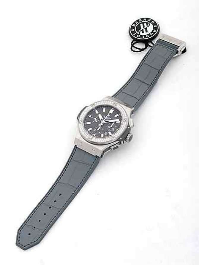 Стальной корпус диаметром 41 мм. Безель золотой с шестью титановыми винтами, инкрустирован 114 белыми бриллиантами 1.78 ct. Сапфировое стекло с антибликовым покрытием спереди и на задней крышке корпуса. Заводная головка и кнопки хронографа с серыми резиновыми вставками. Водонепроницаемость до 100 метров. Серый циферблат с накладными цифрами и индексами. Трапециевидная апертура для индикатора даты на 4:30. Стрелки с белым люминесцентным покрытием. Модель оснащена автоматическим механизмом хронографа HUB 4100, состоящим из 252 деталей, на 28 камнях и запасом хода 42 часа. Калибр отлично отделан - сатинированные и полированные скошенные мосты, титановые винты с черным PVD-покрытием, ротор из карбида вольфрама, родированная платина.