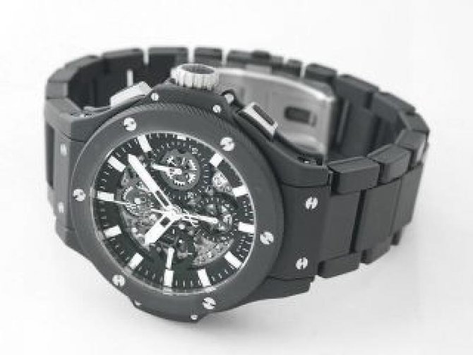 Довольно интересная модель мужских наручных часов Aerobang Black Magic 44mm Collection 311.CI.1170.CI от часовых мастеров Hublot отличается уникальным дизайном и функциональностью. Круглый корпус выполнен из керамики, и имеет такие параметры: 44 мм в диаметре. Несомненно одни из главных достоинств этой модели это повышенная водостойкость и хронограф. На черном циферблате шикарно смотрятся отлитые вручную белые стрелки. Окошко с датой находится на позиции между 4 и 5 часами. Прочные устойчивые к царапинам и прочим повреждениям стекла из сапфира, закрывают часы с двух сторон. Ультратонкий механизм оснащен калибром HUB 4214, и имеет запас хода на 42 часа. Благодаря задней крышке выполненной из сапфира можно наблюдать за работой точного механизма. Водонепроницаемость модели составляет 100 метров. Браслет выполнен из керамики, и оснащен вставкой из нержавеющей стали.