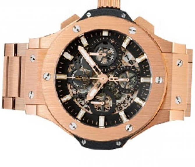 Очередная интересная модель мужских наручных часов Aerobang Gold 44mm Collection 311.PX.1180.PX от часовых мастеров Hublot отличается уникальным дизайном и функциональностью. Круглый корпус выполнен из 18-каратного розового золота, и имеет такие параметры: 44 мм в диаметре. Несомненно одни из главных достоинств этой модели это повышенная водостойкость и хронограф. На черном циферблате шикарно смотрятся отлитые вручную золотистые стрелки. Окошко с датой находится на позиции между 4 и 5 часами. Прочные устойчивые к царапинам и прочим повреждениям стекла из сапфира, закрывают часы с двух сторон. Ультратонкий механизм оснащен калибром HUB 4214, и имеет запас хода на 42 часа. Благодаря задней крышке выполненной из сапфира можно наблюдать за работой точного механизма. Водонепроницаемость модели составляет 100 метров. Браслет сделан из 18-каратного розового золота и оснащен раскладывающейся застежкой.