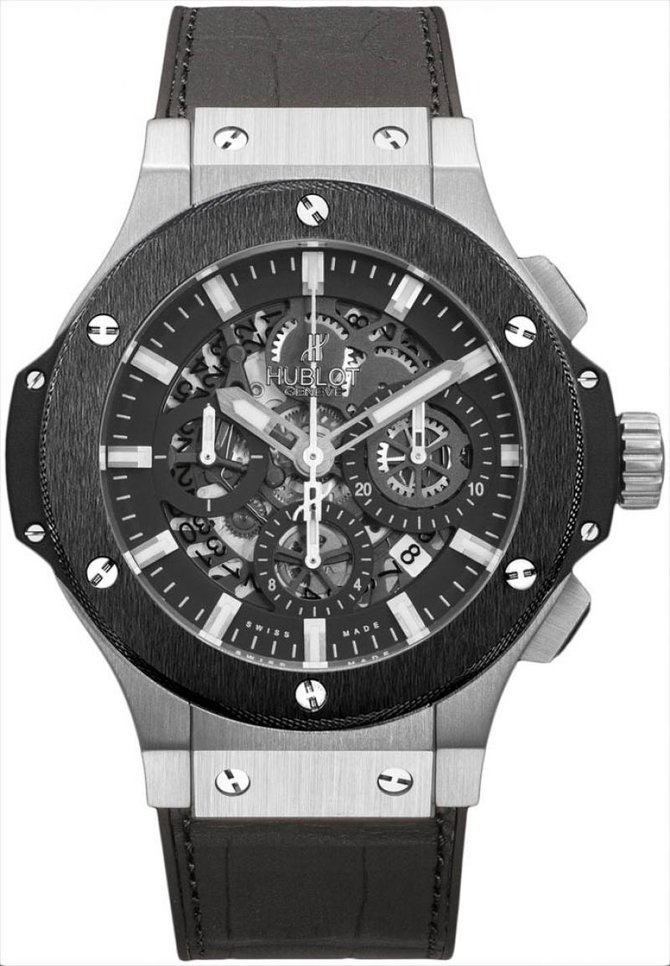 Довольно интересная модель мужских наручных часов Aerobang Big Bang 44mm Collection 311.SM.1170.GR от часовых мастеров Hublot отличается уникальным дизайном и функциональностью. Комбинированный корпус выполнен из нержавеющей стали и керамики, и имеет такие параметры: 44 мм в диаметре. Несомненно одни изглавных достоинств этой модели это повышенная водостойкость и хронограф. На черном циферблате шикарно смотрятся отлитые вручную белые стрелки. Окошко с датой находится на позиции между 4 и 5 часами. Ультратонкий механизм оснащен калибром HUB 4214, и имеет запас хода на 42 часа. Благодаря задней крышке выполненной из сапфира можно наблюдать за работой точного механизма. Водонепроницаемость модели составляет 100 метров. Ремешок сделан из кожи аллигатора, и оснащен вставкой из нержавеющей стали.