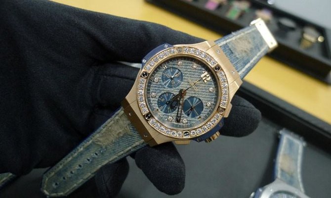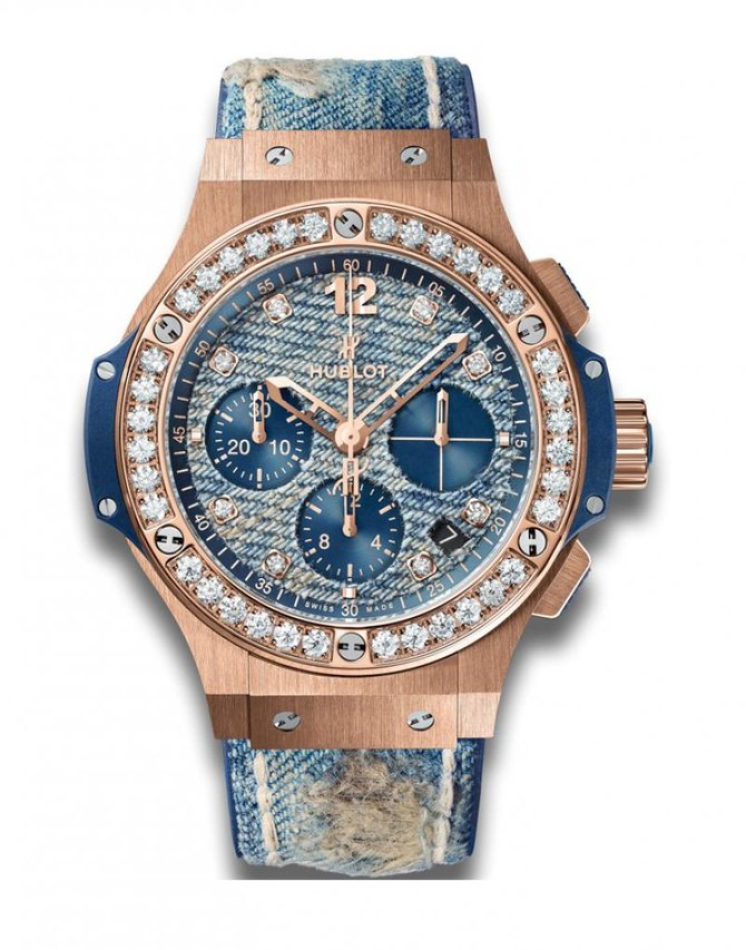 Швейцарские водостойкие наручные часы с хронографом от известной часовой компании Hublot в корпусе из качественного розового 18-каратного золота. Безель часов декорирован 36-ю белыми бриллиантами, общим весом 1.8 ct. Часовая модель выполняет свои функции благодаря автоматическому механизму, Калибр MHUB4100, с хронографом и 42-часовым запасом хода. Диаметр корпуса - 44 миллиметра. Безель и ремешок прикреплены фирменными винтами. На джинсовом циферблате часов отображаются часы, минуты, секунды и дата, а также счетчики хронографа. К запястью модель крепится комбинированным ремешком из джинса и каучука с золотой застежкой. Герметичность золотого корпуса - 100 метров. Сапфировое стекло, которым покрыт циферблат, с нанесением двойного антибликового покрытия. Представленная модель швейцарских часов пополнила коллекцию "Big Bang" бренда Hublot. Выпуск часов ограничен 200 экземплярами!