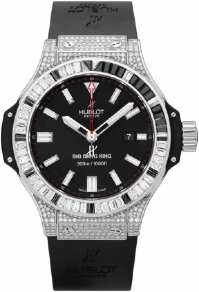 Производитель Hublot представляет очередную модель мужских наручных часов из серии Big Bang King collection 322.LX.1023.RX.0904 Palladium Jewellery. Корпус данной модели часов круглый, выполнен из палладия, и имеет параметры: 48 мм в диаметре. Одно из главных достоинств данной модели конечно же водостойкость. И действительно, часы впечатляют водонепроницаемостью в 300 метров. На черном циферблате великолепно смотрятся отлитые вручную зеленые стрелки. Автоматический механизм оснащен калибром HUB 1400 и имеет запас хода на 42 часа. Прочные сапфировые стекла, устойчивые к царапинам и другим повреждениям закрывают корпус с обеих сторон. Апертура с датой находится на позиции 3 часа. Ремешок черный, каучуковый, оснащен вставками из палладия, и раскладывающейся застежкой. Также данную модель украшают бриллианты. Корпус инкрустирован белыми бриллиантами 2.03 ct. Вращающийся безель украшен 42-мя белыми и 30-ю черными багетными бриллиантами.