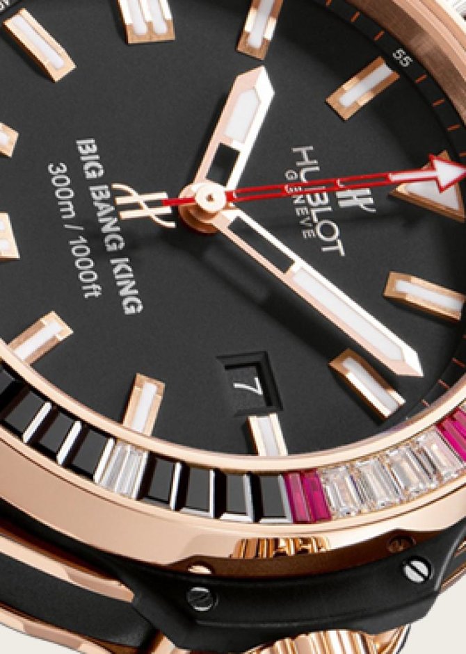 Мастера своего часового дела, производитель Hublot представляют очередную модель мужских наручных часов из серии Big Bang King collection 322.PX.1023.RX.0924 Red Gold Jewellery. Корпус данной модели часов круглый, выполнен из 18-каратного розового золота, и имеет параметры: 48 мм в диаметре. Одно из главных достоинств данной модели конечно же водостойкость. И действительно, часы впечатляют водонепроницаемостью в 300 метров. На черном циферблате великолепно смотрятся отлитые вручную золотистые стрелки. Автоматический механизм оснащен калибром HUB 1400 и имеет запас хода на 42 часа. Прочные сапфировые стекла, устойчивые к царапинам и другим повреждениям закрывают корпус с обеих сторон. Апертура с датой находится на позиции 3 часа. Ремешок черный, каучуковый, оснащен золотой вставкой и 18-каратной раскладывающейся застежкой. Бриллианты и рубины украшают данную модель. Корпус инкрустирован белыми бриллиантами 2.03 ct. Вращающийся безель украшен 36-ю белыми и 28-ю черными багетными бриллиантами и 8 багетными рубинами.