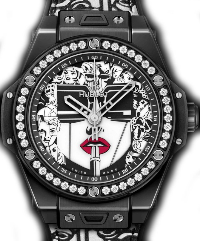 Керамические швейцарские часы HUBLOT 465.CX.1120.VR.1204.LIP20 Big Bang One Click 39 mm Marc Ferrero на художественном циферблате, который накрыт сапфировым стеклом с антибликовыми свойствами, показывают данные текущего времени. Модель работает на базе мануфактурного швейцарского калибра HUB1710 с запасом хода на 50 часов работы и автоматическим подзаводом. Размер корпуса со 100-метровой водонепроницаемостью: 39 х 13.55 мм. Безель украшают белые бриллианты классического типа. Данная модель выпущена в 2020 году ограниченной серией в 100 экземпляров.