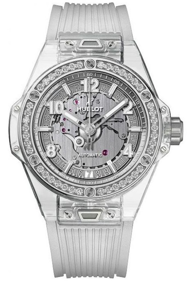 В корпусе из прозрачного сапфирового стекла, диаметром 39 мм, находится часовой калибр HUB1710 с автоматическим подзаводом, который является мануфактурным трудом часовщиков компании Hublot. Модель швейцарских часов Sapphire Diamonds 39 mm (реф. 465.JX.4802.RT.1204) пополнила ряды коллекции Big Bang One Click 39 mm. Установленный калибр с автоподзаводом гарантирует индикацию времени и даты на скелетонированном циферблате, накрытом стеклом из сапфирового кристалла. Корпус имеет базовую водонепроницаемость - 50 метров. Механизм оснащен запасом хода на 50 часов. Лимитированный тираж, которым были выпущены данные часы, составил 200 экземпляров на весь мир.