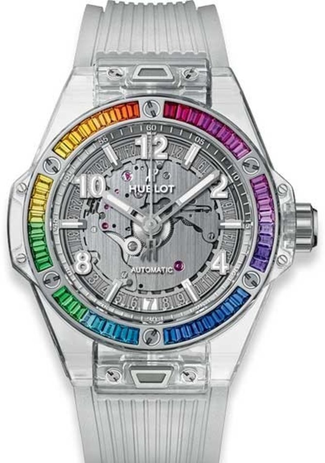 Наручные часы от швейцарской марки Hublot вошли в коллекцию Big Bang One Click. Модель One Click Sapphire Rainbow представлена в корпусе из прозрачного сапфира, диаметром 39 мм, с водонепроницаемостью до 50 метров. Безель часов инкрустирован драгоценными камнями багетной огранки - разноцветными багетными сапфирами. В часах установлен автоматический механизм с запасом хода, рассчитанным на 50 часов работы. На сером циферблате показываются часы, минуты, секунды и дата. Часы поставляются на белом каучуковом ремешке с застежкой из титана. Серия ограничена - 50 экземпляров на весь мир. Водонепроницаемость корпуса гарантирована сапфировым стеклом с лицевой и задней сторон корпуса.
