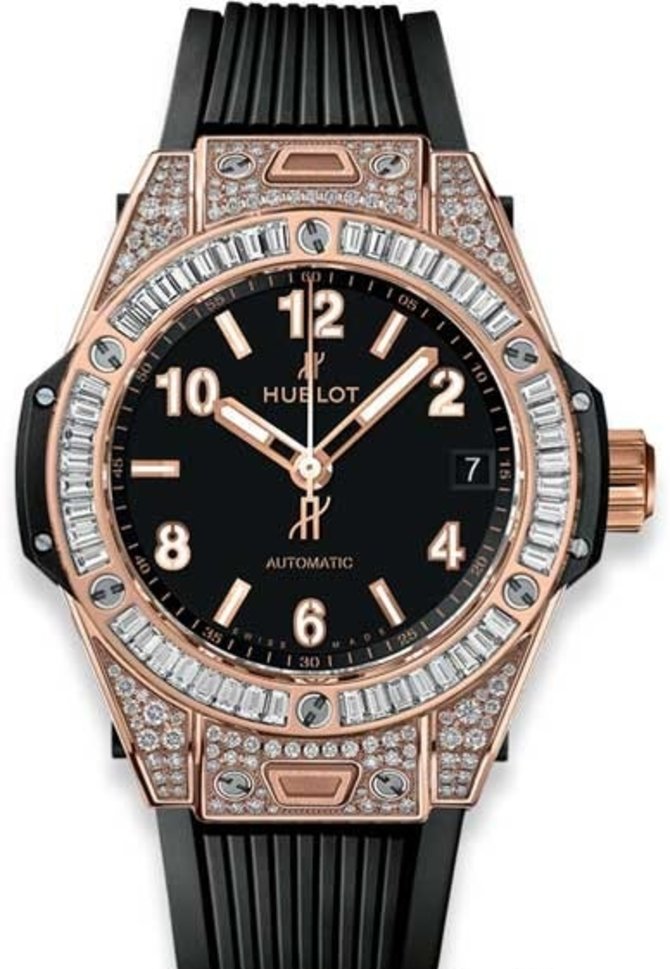 Водонепроницаемость ювелирного корпуса швейцарских часов Hublot Big Bang One Click 39mm 465.OX.1180.RX.0904, что выполнен из розового золота, составляет 100 метров. В часы специалисты поставили автоматический механизм HUB 1710 с запасом хода на 50 часов. На черном циферблате показаны часы, минуты, секунды, дата. В комплекте идет черный каучуковый ремешок с застежкой из розового золота. Корпус украшен белыми бриллиантами. На часовые метки и стрелки из золота нанесено люминесцентное покрытие. Винты из титана, что держат безель на корпусе, выполнены в форме буквы Н от Hublot.