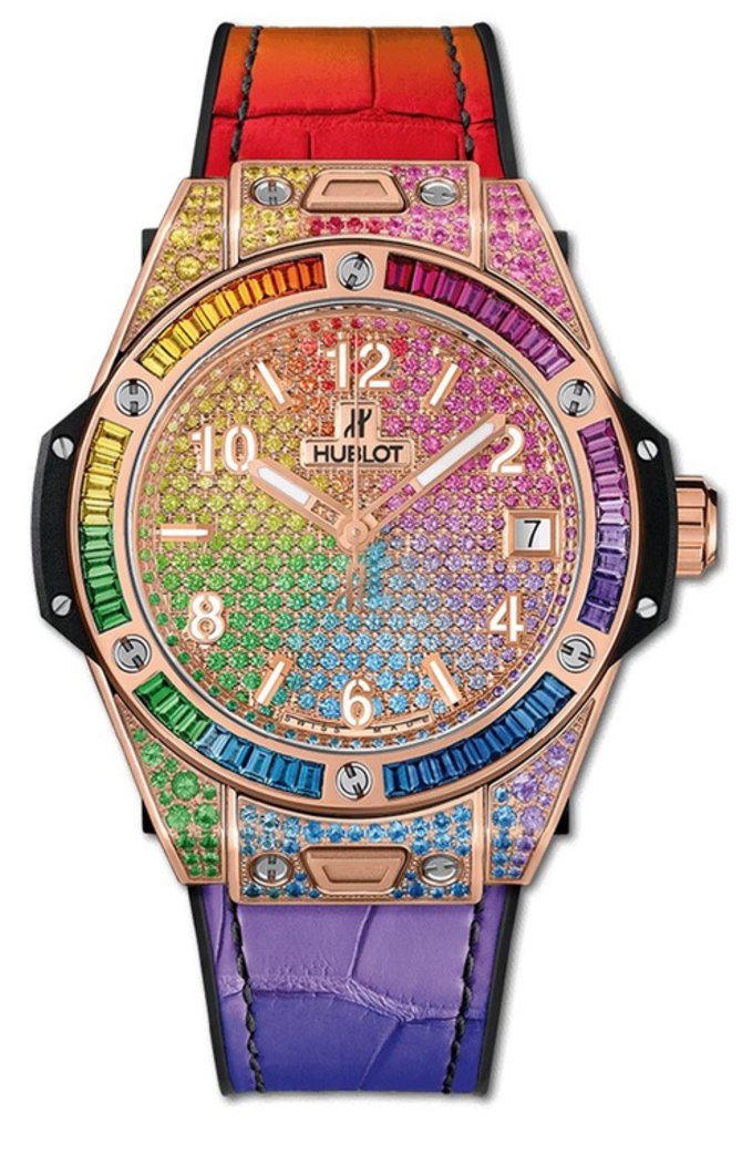 Ювелирные наручные часы для женщин Big Bang One Click 39 mm Rainbow King Gold Ref. 465.OX.9910.LR.0999 от швейцарского часового HUBLOT представлены в ювелирном круглом корпусе из розового золота, который полностью украшен 473 цветными драгоценными камнями - розовыми сапфирами, аметистами, голубыми сапфирами, голубыми топазами, цаворитами, желтыми сапфирами и оранжевыми сапфирами. Общее количество камне: 473. Из них 48 имеют багетную огранку, а 307 - классическую. Золотая заводная головка рифленая. Драгоценный циферблат с золотыми стрелками, покрытыми люминесцентным составом, защищен сапфировым стеклом. Золотая арабская разметка также заполнена люминесцентным составом. Мануфактурный механизм с автоподзаводом HUB1710 отличается беспрерывной работой до 50 часов. Фиолетовый ремень из кожи аллигатора оснащен каучуковой подкладкой и золотой пряжкой.