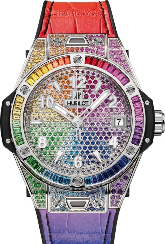 У Hublot представили яркие ювелирные женские наручные часы Big Bang One Click 39 mm 465.SX.9910.LR.0999 на базе автоматического калибра HUB1710, что отвечает за индикацию текущего времени, даты. Корпус круглой формы, размером 39 мм, выполнен из нержавеющей стали и белого золота. Он фиксируется на руке ремнем из кожи аллигатора со стальной застежкой. Циферблат украшен множеством драгоценных камней: рубины, розовые сапфиры, аметисты, синие сапфиры, синие топазы, цавориты, желтые сапфиры и оранжевые сапфиры. Он защищен стеклом из натурального сапфирового кристалла с противобликовыми свойствами. Запас хода установленного калибра - 50 часов. Часовая разметка со стрелками дополнена люминесцентным составом. Безель из багетных сапфиров, рубинов, аметистов, топазов, цаворитов, корпус инкрустирован разноцветными сапфирами, рубинами, аметистами, топазами, цаворитами. Водонепроницаемость корпуса - 100 метров.