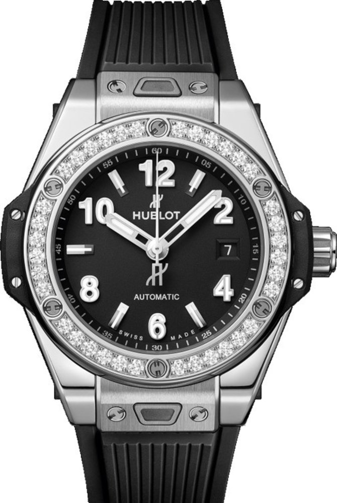 Швейцарская часовая компания Hublot презентовала наручные часы Big Bang One Click 33 mm 485.SX.1170.RX.1204 в корпусе из нержавеющей стали, диаметром 33 мм, внутри которого установлен механический калибр HUB1120 с индикацией таких данных: часы, минуты, секунды, дата. Безель инкрустирован бриллиантами белого цвета с классической огранкой. В комплекте поставляется каучуковый ремень с классической вставкой. Циферблат накрыт стеклом из сапфирового кристалла. Корпус обладает 100-метровой герметичностью. На часовые метки и стрелки нанесено люминесцентное покрытие.