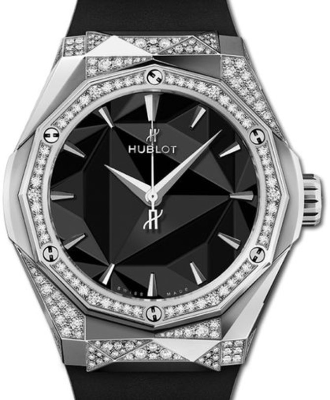 Новая модель от компании HUBLOT - 550.NS.1800.RX.1804.ORL19 Orlinski 40 mm, вошедшая в коллекцию "Сlassic Fusion", представлена в корпусе из титана, который инкрустирован белыми бриллиантами классической огранки. Элегантные швейцарские часы функционируют на базе механического мануфактурного механизма HUB1100 с автоподзаводом и запасом хода на 42 часа. Герметичность корпуса модели - 50 метров. Год выпуска данной модели - 2019. Ремешок сделан из натурального черного каучука. Застежка выполнена из титана. Циферблат защищает стекло из натурального сапфирового кристалла с нанесением противобликового состава. Безель крепится к корпусу винтами из титана в форме буквы Н.