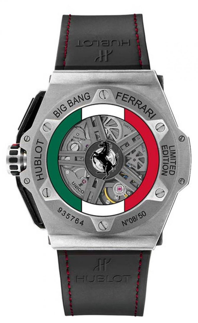 Одна из моделей представлена в корпусе из 18-каратного золота King Gold, а вторая – из титана. В корпус, диаметр которого составляет 45,5 мм, установлен калибр HUB 1241 Unico с функцией flyback и 72-часовым запасом хода. При оформлении циферблата были использованы зеленый и красный цвета, напоминающие о фирменных цветах Ferrari и национальных цветах Мексики. На задней крышке часов установлено сапфировое стекло, благодаря которому можно увидеть логотип компании Ferrari. Модели Big Bang Ferrari Mexico Limited Edition выпущены лимитированным тиражом: 25 экземпляров в золотом корпусе и 50 экземпляров в титановом корпусе.