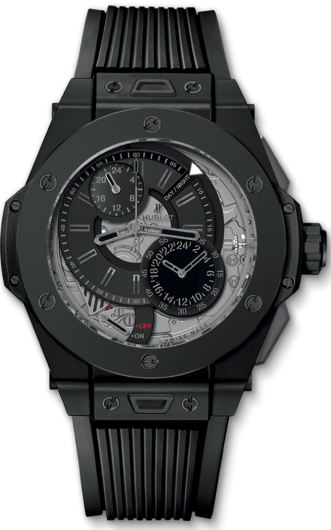 Данный часовой экземпляр от Hublot был представлен на выставке SIHH 2016. Часы Hublot Big Bang Unico 45 mm Alarm Repeater (Ref. 403.CI.0140.RX) выпущены в честь празднования 10-летнего юбилея серии Big Bang. Стильные наручные швейцарские часы с шикарным оформлением и стойким звуком с кнопкой управления на боковой части корпуса представлены ограниченным тиражом в 100 экземпляров. Циферблат открывает вид на часть внутренней отделки часового механизма и на движение люминесцентных молотов, создающих звон репетира. Калибр HUB5003 работает от ручного подзавода, обладает запасом хода в 72 часа. Также модель имеет дополнительный 24-часовой счетчик на циферблате, служащий для индикации второго времени. Черный керамический корпус 45 мм в диаметре защищается сапфировым стеклом с антибликовым покрытием. Каучуковый ремень - в комплекте. Керамический безель традиционно закреплен титановыми винтами с черным PVD покрытием.Герметичность корпуса минимальна - 30 метров.