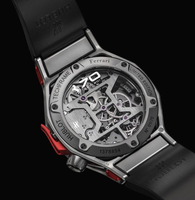 Techframe Ferrari Tourbillon Chronograph 408.NI.0123.RX - модель швейцарских часов от Hublot, которой мастера бренда пополнили коллекцию Big Bang, представлена в эргономичном корпусе из титана. Набор функций у часов широк - часы, минуты, секунды, турбийон, хронограф. Внутри корпуса, размером 45 х 14.8 мм, стоит мануфактурный калибр HUB6311 с хронографом и турбийоном, а также со 115-часовым запасом хода. На запястье часы фиксируются ремешком из каучука и титановой застежкой классического типа. Корпус с достойной водоустойчивостью - 50 метров. Ограниченный тираж - 70 экземпляров. Также данная модель имеет версии в корпусе из белого золота и карбона.