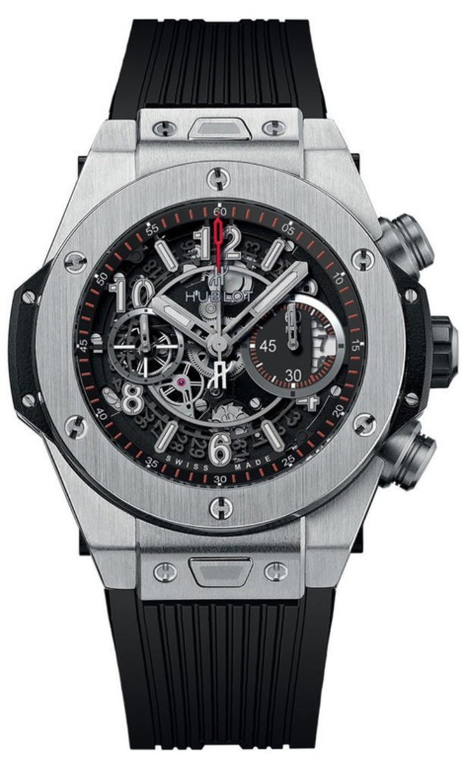 Швейцарские спортивные наручные часы с хронографом от часовой компании Hublot представлены торговой маркой в титановом корпусе, диаметром 45 мм. Часовая модель выполняет свои функции на автоматическом механизме с функцией хронографом и 42-часовым запасом хода. Безель, как обычно у Hublot, прикреплен 6-ю брендовыми винтами из титана. На сером скелетонизированном часовом циферблате отображаются часы, минуты, секунды, дата и данные счетчиков хронографа. К запястью модель крепится прочным каучуковым браслетом черного цвета с раскладной застежкой. Герметичность корпуса на уровне 100 метров. Сапфировое стекло, которым покрыт циферблат, с нанесением двойного антибликового покрытия. Представленная модель швейцарских часов пополнила коллекцию "Big Bang Unico" бренда Hublot.