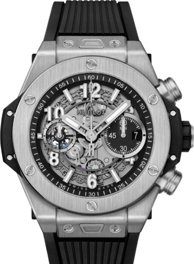 Круглый корпус швейцарских часов Hublot Big Bang Unico 44 mm 421.NX.1170.RX выполнен из титана, диаметром 44 х 14.5 мм. Безель крепится титановыми винтами. Внутри корпуса установлен автоматический калибр HUB1280 с хронографом и запасом хода на 3 суток. Циферблат, где показываются часы, минуты, секунды, дата, накрыт стеклом из сапфирового кристалла. Для фиксации часов на руке в комплекте поставляется ремешок из каучука с застежкой из титана. Водонепроницаемость корпуса рассчитана на 100 метров. Часы выпущены в 2021 году. Стрелки и часовые метки светятся в темноте благодаря люминесцентному покрытию.