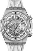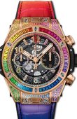 У Hublot представили яркие ювелирные мужские наручные часы Big Bang Unico Chronograph 42 mm 441.NX.1117.LR.0999 на базе автоматического калибра HUB1280, что отвечает за индикацию текущего времени, даты, хронографа. Корпус круглой формы, размером 42 мм, выполнен из титана и белого золота. Он фиксируется на руке ремнем из кожи аллигатора с титановой застежкой. Циферблат-скелетон защищен стеклом из натурального сапфирового кристалла с противобликовыми свойствами. Запас хода установленного калибра - 72 часа. Часовая разметка со стрелками дополнена люминесцентным составом. Безель из 48-ми аметистов, рубинов, топазов, цаворитов и цветных сапфиров, корпус инкрустирован 170 рубинами, розовыми сапфирами, аметистами, синими сапфирами, синими топазами, цаворитами. Водонепроницаемость корпуса - 100 метров.