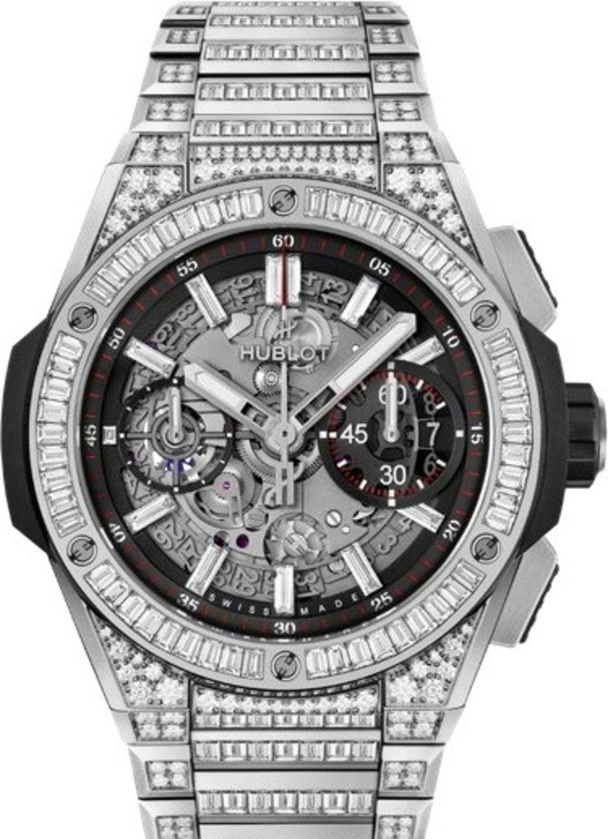 Часовая мануфактура Hublot презентовала модель Big Bang Integral 42 mm 451.NX.1170.NX.9804 в корпусе из титана, диаметром 42мм, полностью инкрустированном бриллиантами. Также бриллиантами украшен титановый браслет с раскладной пряжкой. Безель фиксируется титановыми винтами в форме буквы Н - заглавной буквы в названии бренда. На скелетонированном циферблате, защищенном стеклом из сапфирового кристалла, показываются часы, минуты, секунды, дата, показания хронографа. Корпус герметичен до 100 метров. Год выпуска часов - 2021. Внутри корпуса установлен мануфактурный калибр с автоподзаводом HUB1280 производства инженеров Hublot с функцией хронографа. На стрелки и часовые метки нанесено люминесцентное покрытие, которое светится в темноте. Запас хода механизма рассчитан на 72 часа.