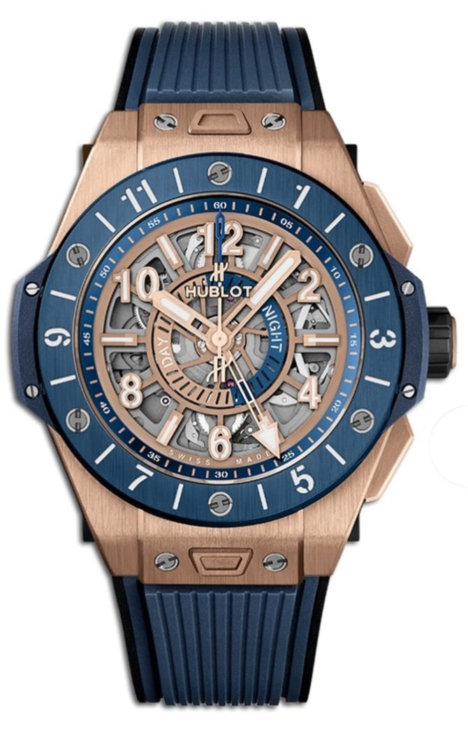 Версия модели механических швейцарских часов HUBLOT, пополнившая коллекцию Big Bang Unico в 2019 году, модель 45 mm King Gold Blue Ceramic, представлена в комбинированном корпусе из розового 18-каратного золота и керамики синего цвета, диаметром 45 мм со 100-метровым уровнем герметичности. Автоматический мануфактурный калибр HUB1251, которым оснащены данные часы, обладает запасом хода на 3 суток работы без подзавода. Циферблат-скелетон накрыт сапфировым кристаллом, сквозь которое видна индикация текущего времени и даты. Стрелки и часовая разметка из золота заполнены люминесцентным составом. Каучуковый ремень синего цвета с вертикальными углублениями и золотая застежка зафиксируют часы на запястье руки. Безель из керамики на корпусе фиксируют титановые винты.