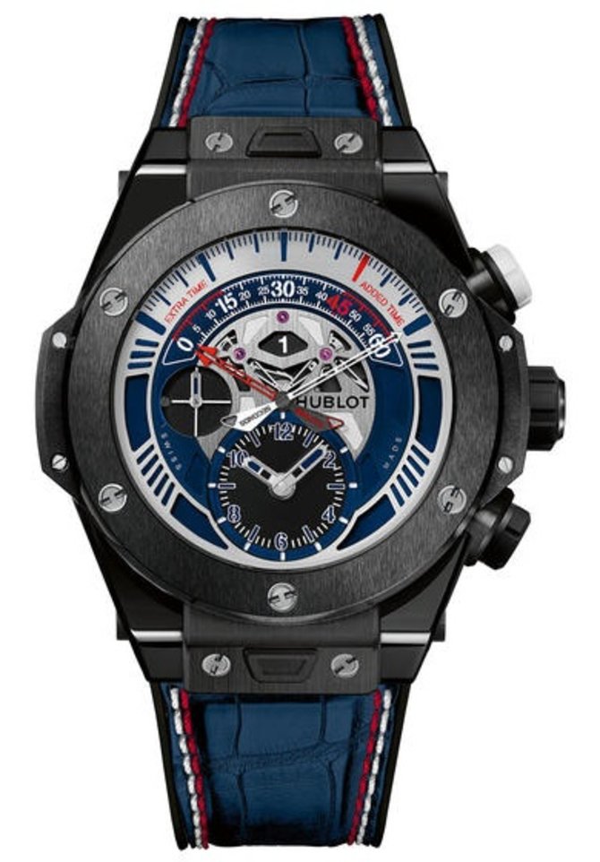 Представленная модель спортивных часов с хронографом была представлена брендом Hublot в предверии чемпионата Европы по футболу UEFA EURO 2016, который на сегодняшний день проходит во Франции. На уникальном циферблате указываются часы, минуты, секунды и данные хронографа. В керамическом корпусе, диаметром 45 мм, функционирует автоматический мануфактурный механизм. Герметичность корпуса, заявленная брендом Hublot - 100 метров. Верх ремешка - натуральная крокодилья кожа; подкладка - каучук. Раскладывающаяся застежка выполнена из титана. Сапфировое стекло с антибликовым покрытием надежно защищает циферблат.