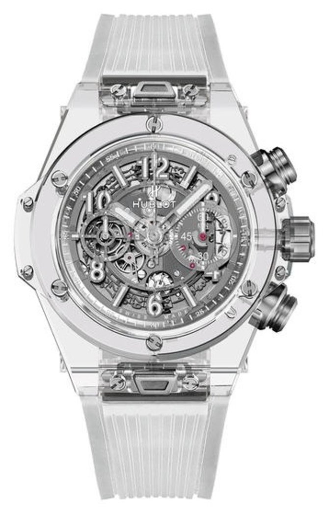 2016 год для швейцарского часового бренда Hublot - год новых открытий! На этот раз компания представила наручные часы в 45-миллиметровом корпусе из сапфира, внутри которого разместила мануфактурный механизм собственной разработки, функционирующий от автоподзавода. На скелетонизированном циферблате указываются часы, минуты, секунды, дата и данные хронографа. Модель укомплектована ремешком из каучука и титановой раскладывающейся застежкой. К слову, ремешок оснащен специальной системой быстрой замены в один клик. Корпус обладает 100-метровой герметичностью, что позволяет в часах мыться, купаться в водоемах и нырять на небольшую глубину (до 10 атм).