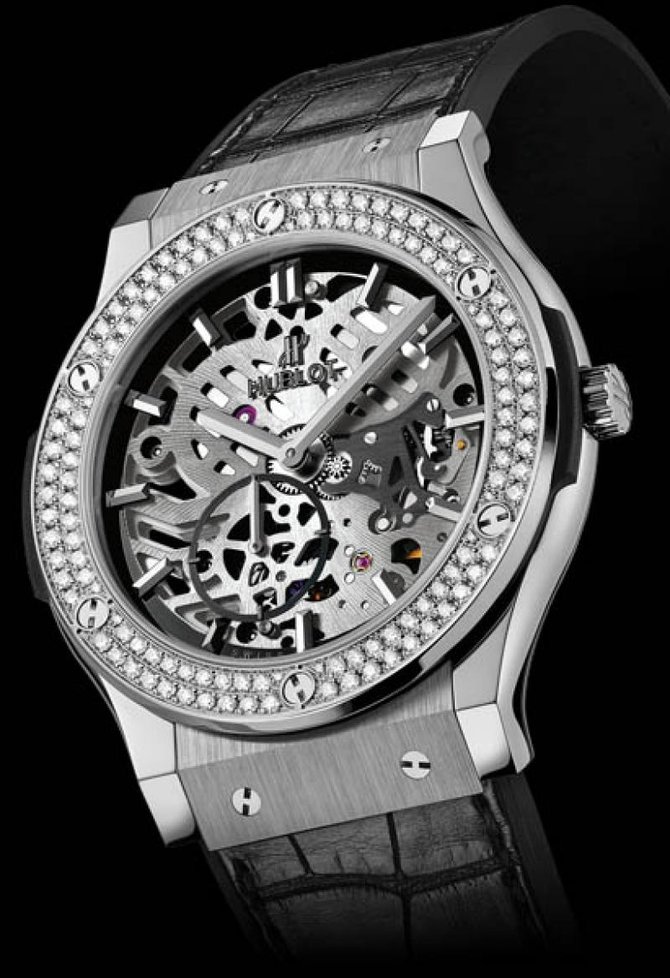 Очередная великолепная модель мужских наручных часов Classic Fusion Classico Ultra-Thin Titanium Diamonds REF : 515.NX.0170.LR.1104 от производителя Hublot не оставит к себе никого равнодушным, потому как завораживает своим внешним потрясающим видом и функциональностью. Круглый корпус выполнен из прочного материала титан, и имеет 45 мм в диаметре. Механизм данной модели оснащен калибром HUB 1300, и имеет запас хода на 90 часов. Прочные сапфировые стекла, устойчивые к царапинам и другим повреждениям закрывают корпус с обеих сторон. Благодаря задней прозрачной крышке, можно наблюдать за работой механизма. На серебристом циферблате шикарно смотрятся отлитые вручную посеребренные стрелки. Водонепроницаемость модели составляет 50 метров. Ремешок черный из кожи крокодила, оснащен раскладывающейся застежкой. Безель инкрустирован 126 белыми бриллиантами 1.41 ct.