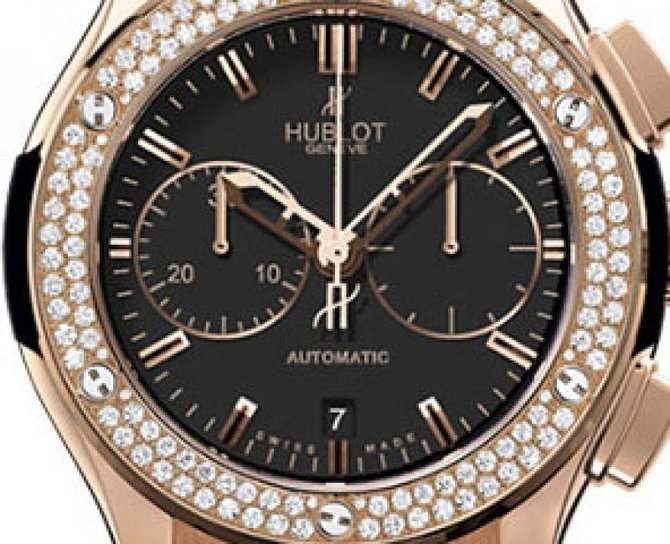 Очередная великолепная модель мужских наручных часов Fusion Chronographe Gold 521.OX.1180.LR.1104 от производителя Hublot не оставит к себе никого равнодушным, потому как завораживает своим внешним классическим видом и функциональностью. Одно из главных достоинств модели -хронограф. Круглый корпус выполнен из 18-каратного розового золота, и имеет такие размеры: 45 мм в диаметре. Автоматический механизм данной модели оснащен калибром HUB 1110, и имеет запас хода на 42 часа. Прочные сапфировые стекла, устойчивые к царапинам и другим повреждениям закрывают корпус с обеих сторон. Апертура с датой находится на позиции 3 часа. На черном циферблате шикарно смотрятся отлитые вручную золотистые стрелки. Водонепроницаемость модели составляет 50 метров. Ремешок черный, комбинированный, сделан из кожи аллигатора и каучука, оснащен золотой 18-каратной вставкой и раскладывающейся застежкой. Также на данной модели присутствуют бриллианты. Безель украшен 126-ю белыми бриллиантами общим весом 1.6 ct.