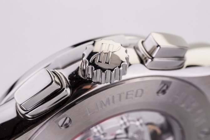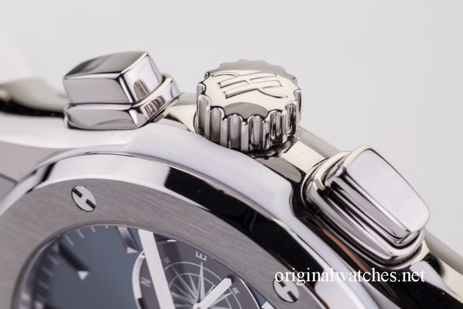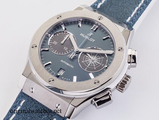 Компания Hublot выпустила модель наручных часов с хронографом, которые вошли в коллекцию CLASSIC FUSION. Титановый корпус круглой формы, диаметром 45 мм, содержит внутри себя мануфактурный механизм с автоподзаводом и спортивной функцией хронографа. На голубом циферблате, находящемся под защитой сапфирового стекла с надежным антибликовым покрытием, указываются часы, минуты, секунды, дата и все необходимые данные хронографа. Безель прикреплен титановыми винтами формы буквы Н. Кнопки для управления хронографом расположены с двух сторон рифленой заводной головки. Ремешок из натуральной кожи обеспечен прочной каучуковой подкладкой и раскладной застежкой из титана. Водонепроницаемость корпуса часов - 50 метров. Задняя крышка выполнена из сапфирового стекла.