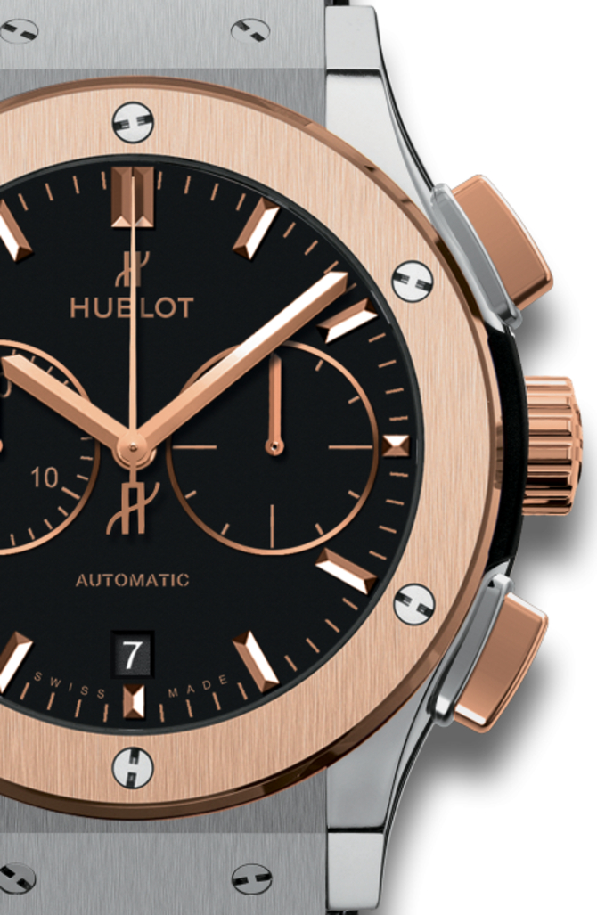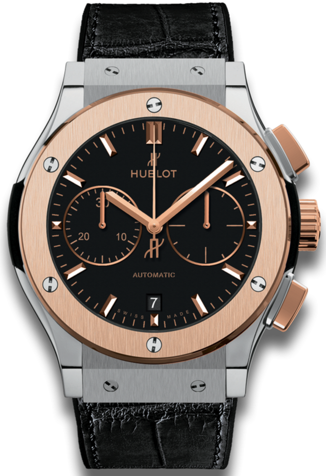 Многофункциональные швейцарские наручные часы, выпущенные швейцарской часовой мануфактурой Hublot, функционируют на швейцарском мануфактурном калибре от Hublot "HUB1143" с автоподзаводом и функцией хронографа. Механизм обладает официальным сертификатом хронометра COSC (выдан швейцарским институтом хронометрии). На циферблате черного цвета, при помощи стрелок, индексов и меток из золота, указываются часы, минуты, секунды, дата и данные хронографа. Корпус, диаметром 45 миллиметров, изготовлен из яркой комбинации розового золота и титана. Циферблат покрыт натуральным сапфировым стеклом. Герметичность корпуса - 50 метров (5 атм.). Модель укомплектована ремешком из кожи крокодила и классической пряжкой. Запас хода механизма - 42 часа. Балансовая частота - 28 800 пк/час. Калибр состоит из 280 элементов, 59 из них - драгоценные камни.