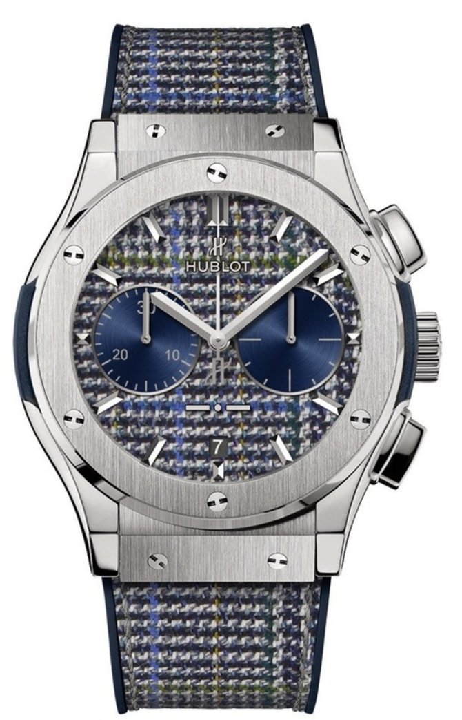 Модель от компании Hublot из серии, основанной для создания делового мужского образа. Часы идеально подойдут под мужской костюм. Hublot Classic Fusion Chronograph Italia Independent Titanium представлены в титановом корпусе. Циферблат, а также ремешок на каучуковой подкладке выполнены из подлинной костюмной ткани с рисунком «принц Уэльский» от Рубиначчи. Из функциональности часов нужно подчеркнуть наличие хронографа. Механизм автоматический, механический, мануфактурного производства Hublot (калибр HUB1143). Толщина корпуса - 13.05 мм; диаметр - 45 мм. Запас хода - 42 часа. Герметичность корпуса - 50 метров. Ограниченная серия - 50 экземпляров. Безель закреплен винтами из титана. Лицевое стекло - сапфировое. Стрелки и метки часов из титана.