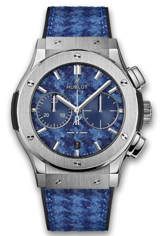 Данные модель швейцарских часов - представитель уже третьей линейки часов, в разработке которой принимает активное участие Лапо Элканн - основатель знаменитой итальянской фирмы Italia Independent. К тому же, Лапо еще привлек к совместной работе бренд Rubinacci, специализирующийся на производстве "люксовых" классических костюмов. Словом, швейцарские часы Hublot Classic Fusion Chronograph Italia Independent Titanium (реф. 521.NX.2710.NR.ITI18) разработаны тремя компаниями, успешно развивающимися в своих направлениях работы - Hublot, Italia Independent и Rubinacci. Именно тканью последней марки покрыта каучуковая основа ремешка и циферблат, где показываются часы, минуты, секунды и хронографа. Корпус сделан из титана. Механизм работает от автоматического подзавода, обладает хронографом, а также имеет запас хода на 42 часа работы.