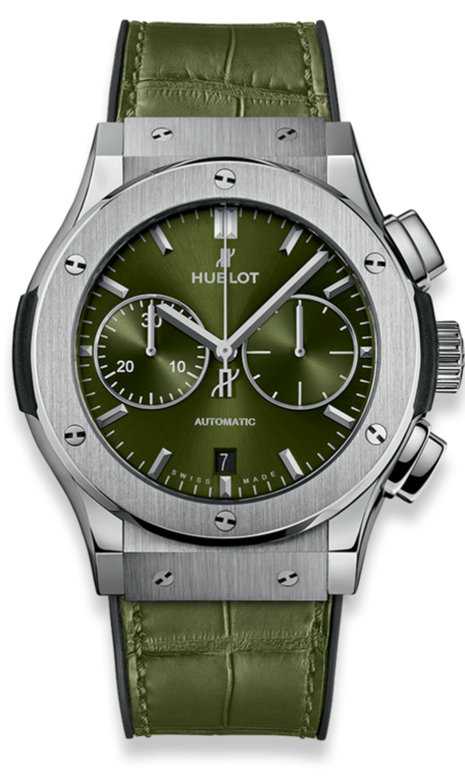 Новая разработка мануфактуры Hublot пополнила коллекцию Classic Fusion. Модель Chronograph Titanium 521.NX.8970.LR имеет корпус из титана, выполненный в круглой форме, диаметром 45 миллиметров. На циферблате сатинированного типа зеленого цвета расположены индикаторы текущего времени и счетчики хронографа, функцией которого оснащен установленный швейцарский автоматический калибр HUB 1143, запас хода которого рассчитан минимум на 42 часа работы. Лучеобразный циферблат с целью защиты от повреждений защищен сапфировым стеклом с антибликовыми свойствами. Ремешок состоит из каучука и кожи крокодила. Каучук служит подкладкой для крокодилового покрытия. Застежка раскладного типа.