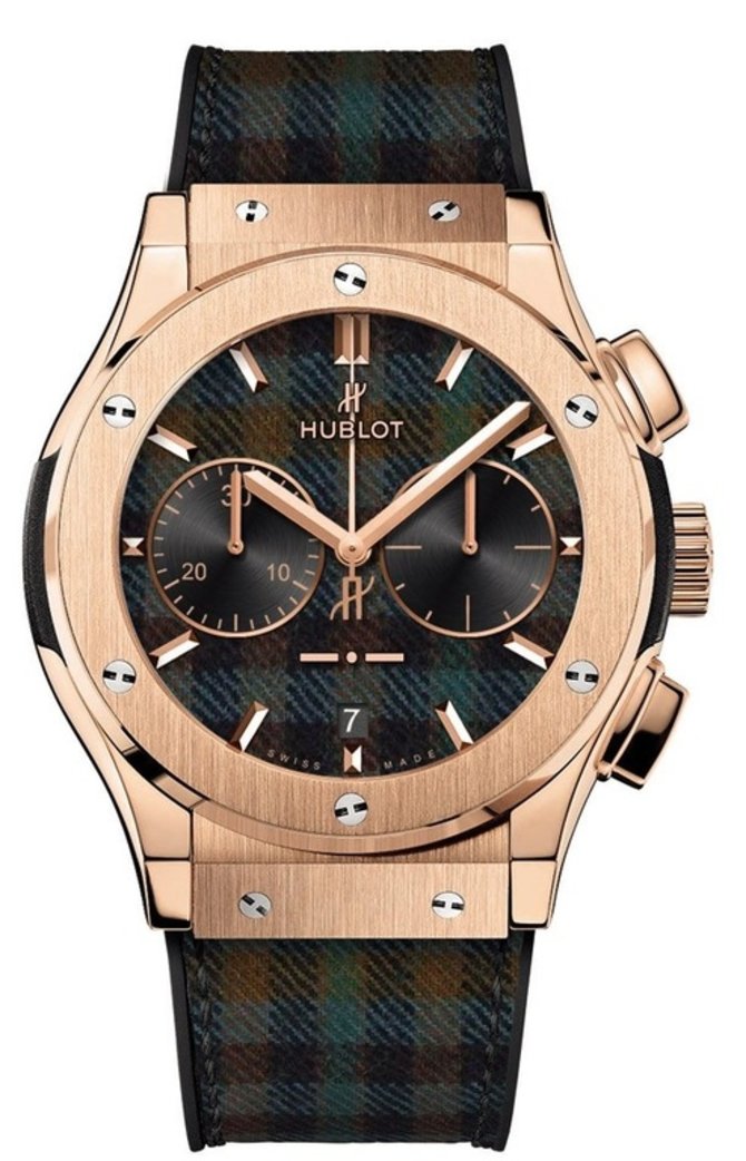 Представленные часы от компании Hublot, вошедшие в коллекцию Classic Fusion, выполнены из уникального сплава, придуманного исключительно металлургами мануфактуры Hublot - сплава "King Gold". Его основа, конечно же - розовое золото, в составе которого еще есть медь и даже 5% платины. Такая комбинация металлов позволяет достаточно сильно укрепить розовое золото. Циферблат и ремешок выполнены в подлинной костюмной ткани с рисунком «шотландка» от экстравагантного итальянского модельера по имени Лука Рубиначчи. Лицевое покрытие циферблата - сапфировое стекло. В комплекте с ремешком идет золотая застежка. Винты, крепящие ремешок и часовой безель - из титана. Мануфактурный механизм HUB1143 с хронографом. Запас хода - 42 часа. Корпус имеет водонепроницаемость на уровне 50 метров. Ограниченный тираж модели - 50 экземпляров.