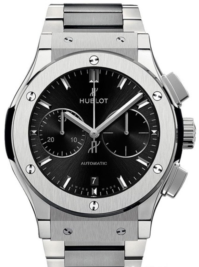 Модель Chronograph Titanium 541.NX.1171.NX вошла в крупную коллекцию бренда Hublot - "Сlassic Fusion". Двигателем швейцарских часов является мануфактурный многофункциональный механический часовой механизм HUB 1143 с хронографом, индицирующий текущее время в часах, минутах и секундах, а также текущую дату. Из титана выполнен корпус, браслет и раскладная застежка. Низ секундной стрелки украшает брендовая буква "Н". Также в фирменном стиле выполнены и винты, которые фиксируют безель и ремешок - в форме "Н". Часовые метки и стрелки сделаны из титана. Водонепроницаемость корпуса - 50 метров. Запас хода механизма - 42 часа. Циферблат накрыт сапфировым стеклом с антибликовым покрытием. Также в сапфировом стекле представлена завинчивающаяся задняя крышка.